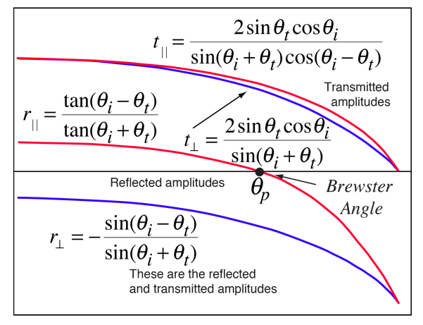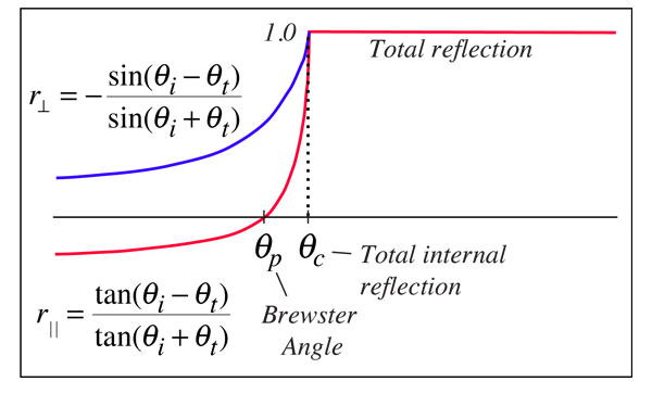 Reflection and TransmissionTypical reflection and transmission curves for external reflection. These curves are the graphical representation of the Fresnel equations. Note that the reflected amplitude for the light polarized parallel to the incident plane is zero for a specific angle called the Brewster angle. The reflected light is then linearly polarized in a plane perpendicular to the incident plane. This polarization by reflection is exploited in numerous optical devices. ![]()