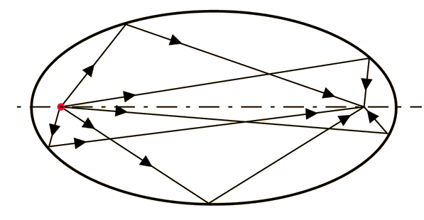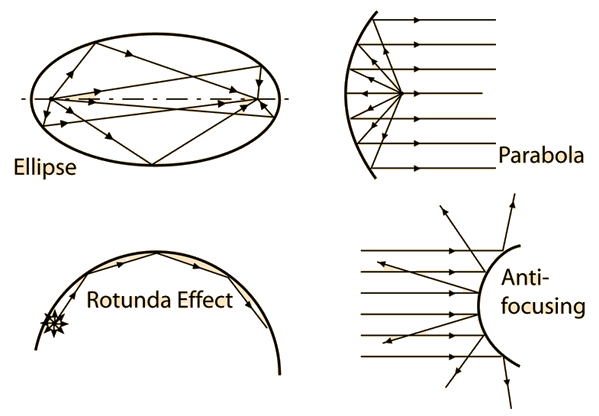 Elliptical EnclosureAn ellipse has two focus points. Sound projected in any direction from one focus point will travel to the other. Sound from any point will tend to be focused toward some point, so ellipses are certainly to be avoided for most acoustical purposes. ![]() "When the prelates of the medieval Cathedral of Agrigento in Sicily chose to hear confessions near the great central door, they undoubtedly did so to ensure the privacy of their parishioners' revelations. Then, quite by accident, someone discovered that behind the high altar 250 feet away the murmuring from the confessional could be clearly heard. 'Secrets never intended for the public ear thus became known,' according to one account, 'to the dismay of the confessor and the scandal of the people.' The architect of the cathedral had inadvertently designed an elliptical gallery . . . The configuration of the walls behind the altar had focused sound waves from a point at the other end of the cathedral, although people in between could hear nothing." (Sound and Hearing, p19)