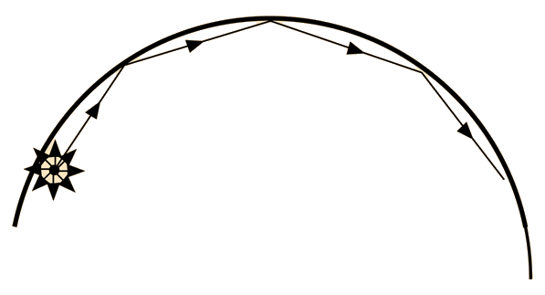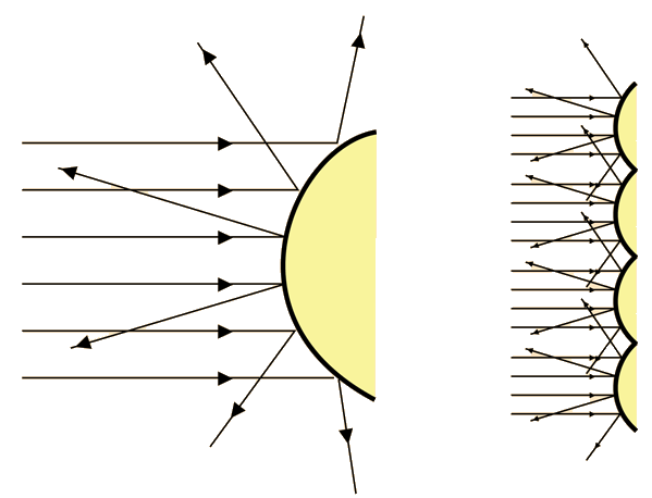 Anti-focusing Surfaces![]() Since even dispersion of sound is highly desirable in an auditorium, it may be necessary to take steps to overcome any focusing surfaces. If an architect decides that some curved surface is desirable for some reason, then the undesirable focusing effect may be partially overcome by covering the curved surface with anti-focusing surfaces.