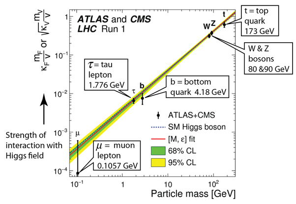 ![]() Click on particle for more discussion. This is modified from Figure 4 of the Atlas Bulletin. It shows data from Atlas and CMS to depict the proportionality of particle mass to the strength of the interaction with the Higgs field. Continuing studies past the 2013 discoveries have shown the Higgs boson to be consistent with the predicted properties: zero spin, no electric charge, no strong force interaction, even parity. Even the proportions of the decay paths have agreed with those predicted. The Atlas and CMS collaboration continues to work on the exploration of the Standard Model of particle physics, and in a 25 October 2019 Bulletin report a Higgs mass of 125.35 +/- 0.15 GeV. |