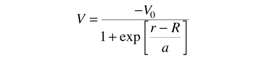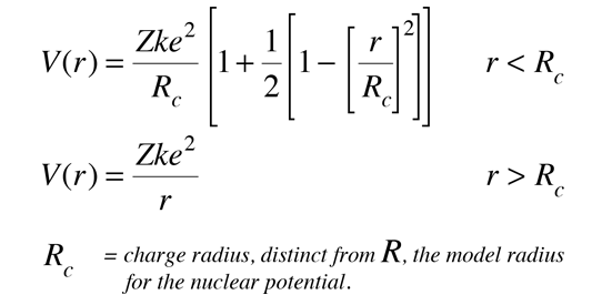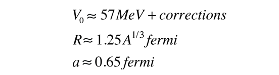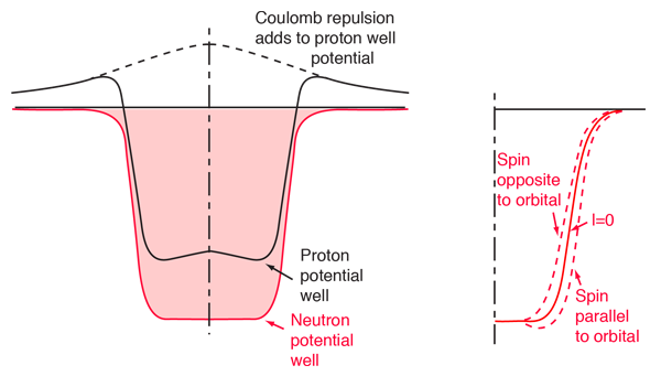 | Nuclear Potential and the Shell ModelThe shell model of the nucleus presumes that a given nucleon moves in an effective attractive potential formed by all the other nucleons. If that is true, then the potential is probably roughly proportional to the nuclear density and therefore could be expressed in the form  The parameters in this model of the potential have been evaluated to be approximately:  Note that the radius above is larger than that given by the nuclear radius formula since it is related to the nuclear force which extends beyond the radius. Two other corrections are typically applied to more nearly fit observations. The first is called the symmetry energy, arising when there is an unequal number of protons and neutrons. Empirically, it is evaluated as  The other correction for protons is the electrostatic repulsion energy, which takes the form  The approximate potentials for neutrons and protons take the general form shown at left below.  The additional correction which must be made is the spin-orbit interaction. Its general effect on the potential well is shown in the sketch above right. If the spin is opposite to the orbital angular momentum, the effective potential well is narrower, giving higher energy in the same manner as the square well potential. This can be seen in the spin-orbit splittings in the shell model level diagram.