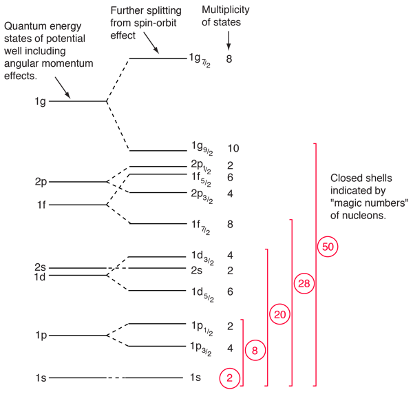 | Shell Model of NucleusVisualizing the densely packed nucleus in terms of orbits and shells seems much less plausible than the corresponding shell model for atomic electrons. You can easily believe that an atomic electron can complete many orbits without running into anything, but you expect protons and neutrons in a nucleus to be in a continuous process of collision with each other. But dense-gas type models of nuclei with multiple collisions between particles didn't fit the data, and remarkable patterns like the "magic numbers" in the stability of nuclei suggested the seemingly improbable shell structure. With the enormous strong force acting between them and with so many nucleons to collide with, how can nucleons possibly complete whole orbits without interacting? This has the marks of a Pauli exclusion principle process, where two fermions cannot occupy the same quantum state. If there are no nearby, unfilled quantum states that are in reach of the available energy for an interaction, then the interaction will not occur. This is essentially a quantum idea - if there is not an available "hole" for a collision to knock a nucleon into, then the collision will not occur. There is no classical analog to this situation. The evidence for a kind of shell structure and a limited number of allowed energy states suggests that a nucleon moves in some kind of effective potential well created by the forces of all the other nucleons. This leads to energy quantization in a manner similar to the square well and harmonic oscillator potentials. Since the details of the well determine the energies, much effort has gone into construction of potential wells for the modeling of the observed nuclear energy levels. Solving for the energies from such potentials gives a series of energy levels like that at left below. The labels on the levels are somewhat different from the corresponding symbols for atomic energy levels. The energy levels increase with orbital angular momentum quantum number l, and the s,p,d,f... symbols are used for l=0,1,2,3... just like the atomic case. But there is really no physical analog to the principal quantum number n, so the numbers associated with the level just start at n=1 for the lowest level associated with a given orbital quantum number, giving such symbols as 1g which could not occur in the atomic labeling scheme. The quantum number for orbital angular momentum is not limited to n as in the atomic case.  In addition to the dependence on the details of the potential well and the orbital quantum number, there is a sizable spin-orbit interaction which splits the levels by an amount which increases with orbital quantum number. This leads to the overlapping levels as shown in the illustration. The subscript indicates the value of the total angular momentum j, and the multiplicity of the state is 2j + 1. The contribution of a proton to the energy is somewhat different from that of a neutron because of the coulomb repulsion, but it makes little difference in the appearance of the set of energy levels. With this set of identified nuclear states and the magic numbers, we can predict the net nuclear spin of a nucleus and represent it's nuclear state based on the identification of the level of the odd nucleon in the order of states shown above. The parity of the state can also be predicted, so the single particle shell model has shown itself to be of significant benefit in characterizing nuclei.