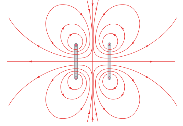 Quadrupole Magnetic FieldTwo properly spaced coils with currents in the same direction can produce a useful magnetic field geometry in the Helmholtz coil arrangement. Also useful is the arrangement obtained by reversing one of the coils to produce a magnetic quadrupole field. ![]()