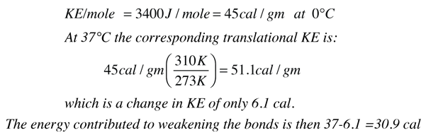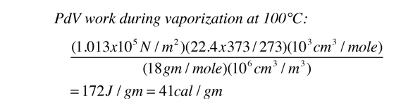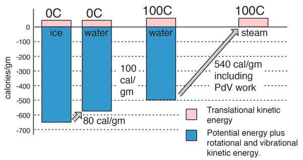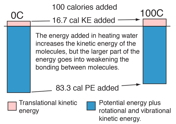Some energy details related to heating waterIn the process of heating water from 0 to 100 C, 100 calories of energy must be added. Part of that energy increases the kinetic energy of the molecules, and some adds to the potential energy. To assess the amount added to kinetic energy, the molecular speeds at the two temperatures may be evaluated with the Boltzmann speed distribution. ![]() The net gain in kinetic energy is then 16.7 calories/gram when the water is heated from 0 to 100 C. The remainder of the energy goes into weakening the attractive forces between the water molecules. This weakening of the intermolecular forces manifests itself in the reduction of the surface tension of water as it is heated. In the process of vaporization of water, a large amount of energy must be added to overcome the remaining cohesive forces between the molecules and an additional amount of energy goes into PdV work to expand the gas from its very small liquid volume to the volume occupied by the resulting vapor. ![]() If the heat of vaporization of water at 100°C is 539 calories, then subtracting the 41 calorie work component suggests that the actual binding energy of the water molecules at 100°C is 539-41=498 calories. Why is the heat of vaporization more at body temperature?An interesting feature of the process of cooling the human body by evaporation is that the heat extracted by the evaporation of a gram of perspiration from the human skin at body temperature (37°C) is quoted in physiology books as 580 calories/gm rather than the nominal 540 calories/gm at the normal boiling point. The question is, why is it larger at body temperature? The main part of the answer is that the binding energy of the water molecules is greater at that lower temperature, and it therefore takes more energy to break them apart into the gaseous state. The change in the heat of vaporization can be roughly calculated using what we know from the specific heat of water, 1 calorie/gm °C. It takes 37 calories to heat a gram of water from 0°C to 37°C, but the change in the kinetic energy is much less than that: ![]() It was shown above that the kinetic energy of the water molecules only increases by 61.7 - 45 = 16.7 calories/gm when the water is heated from zero to 100°C but we know it takes 100 calories to do that heating. Therefore the contribution to weakening the water bonds is 83.3 calories/gm. Using the result for water at 37°C it is evident that 52.4 calories of additional energy must be supplied at 37°C to vaporize the water. There is one additional element in modeling the heat of vaporization at body temperature - the PdV work required to expand the water into its gaseous form is slightly less at 37°C. By analogy with the work calculation above, that work is found to be 34.2 calories/gm, 6.8 calories/gm less than at 100°C. This model then suggests a heat of vaporization at 37°C: So this simple model agrees fairly well with the quoted 580 cal/gm.