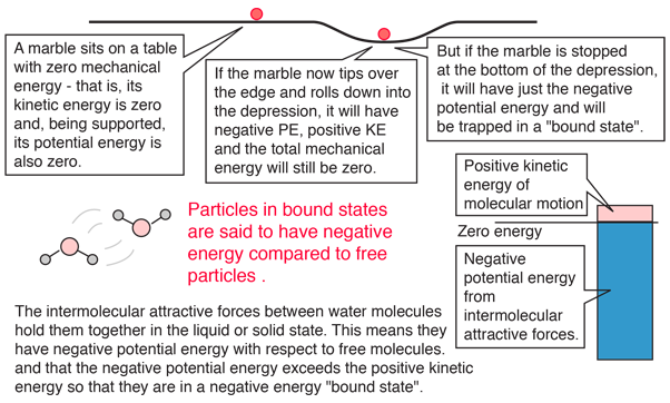 Why is the Potential Energy Negative?In discussing the energy of the phase changes in water, we found that the potential energy is treated as a negative quantity. An analogy with a mechanical system with gravitational potential energy and kinetic energy might be helpful in understanding the logic of a negative energy quantity. You are always free to choose the zero of potential energy, and it seems logical to choose the zero of potential energy such that a free molecule at rest has zero energy. A bound particle at rest then has negative potential energy. ![]()