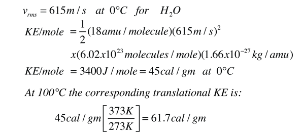 Details of Heating WaterIt is known that 100 calories of energy must be added to raise the temperature of one gram of water from 0° to 100°C. Part of that energy increases the kinetic energy of the molecules, and some adds to the potential energy. ![]() The sizes of the blocks which represent the kinetic energy of the molecules at 0°C and 100°C provide a visual illustration of the meaning of temperature and the nature of the absolute or Kelvin temperature scale. From the definition of kinetic temperature, the size of the block is seen to be proportional to temperature, and the ratios of the heights of the KE blocks is the ratio of the temperatures. But the kinetic temperature is inherently the absolute temperature, so that the ratio of the heights of the blocks is 373K/273K . So the absolute temperature is actually proportional to the translational kinetic energy of the molecules, while the Celsius temperatures are just chosen for convenience.