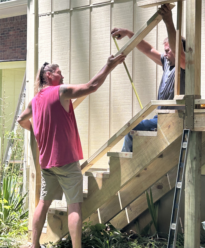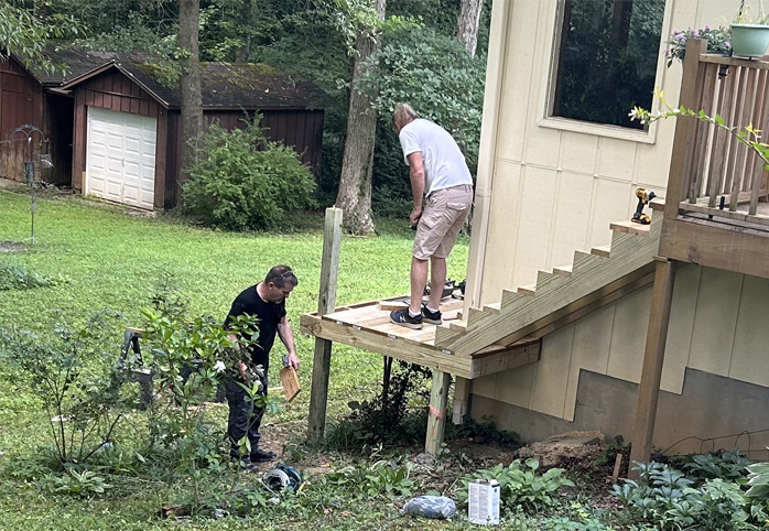 | Mark and Troy work on the placement of the steps and the decking of the lower level. |