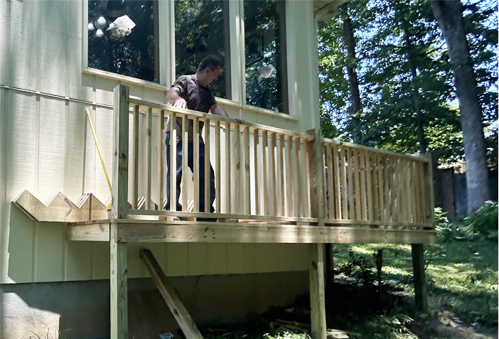 | The next step was the rail on the end of the lower part of the deck. Mark was measuring and making the vertical members at home and bringing them to install. |