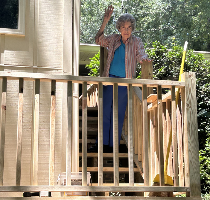 | Brenda at the top of the new stairway on the kitchen side. This gives a view of the new deck on the back of the house. |