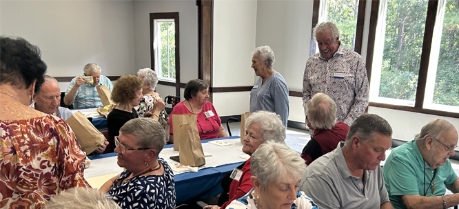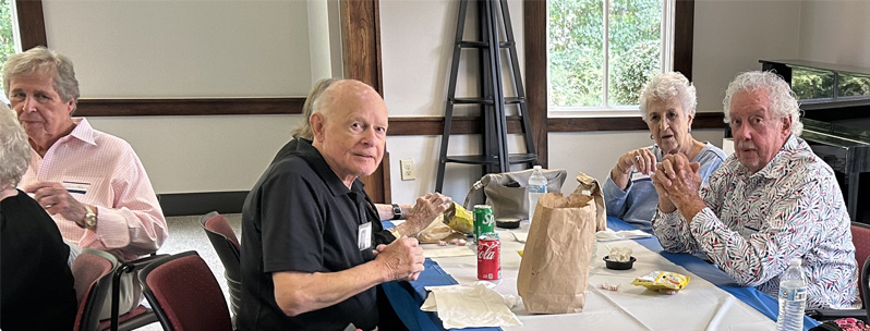| Our lunch was barbecue sandwich sack lunches from Wallace Barbecue. Allen and Mrs Arnold greet the group. Allen was our Chiropractor for many years and now we go to his son Tripp. |