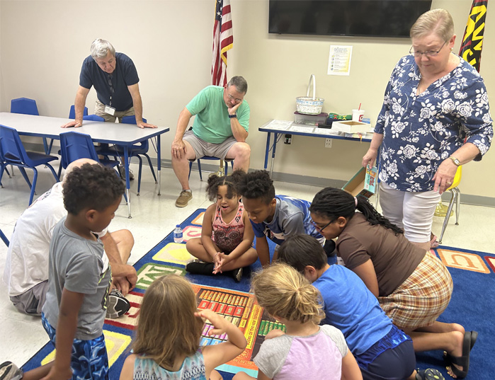 | Johnny Huffman and Tony Mode work with another group of Awanas who are finding answers to questions in the Bible. |