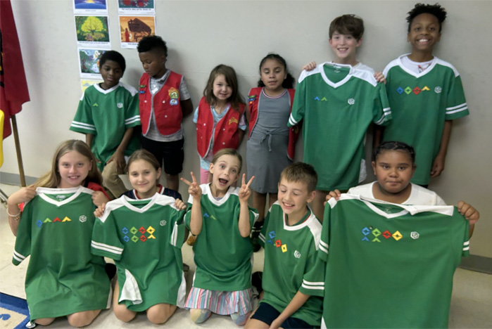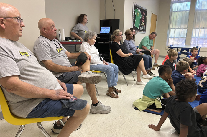 | After our pledges, the Awana group settled in for snack time. Johnny Huffman and Tony Mode accompany them. |