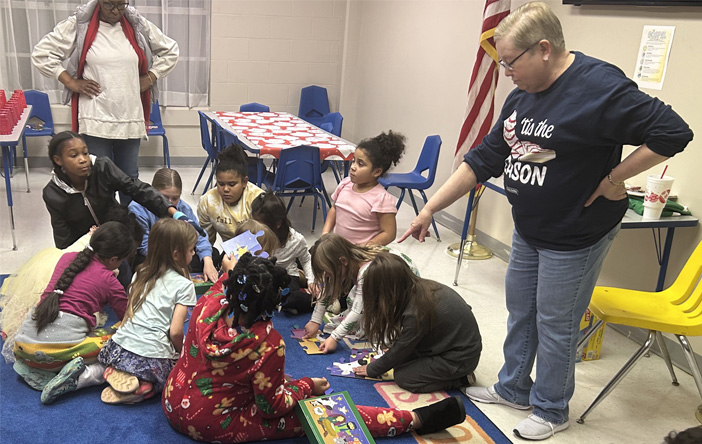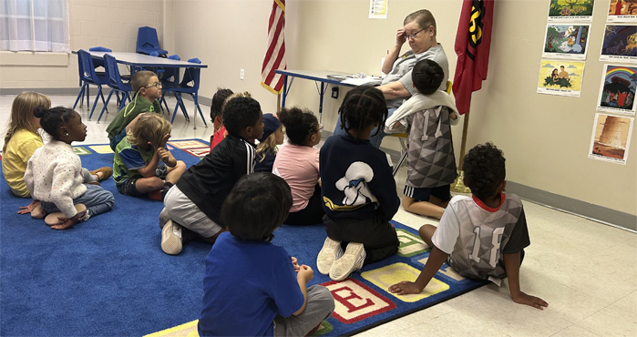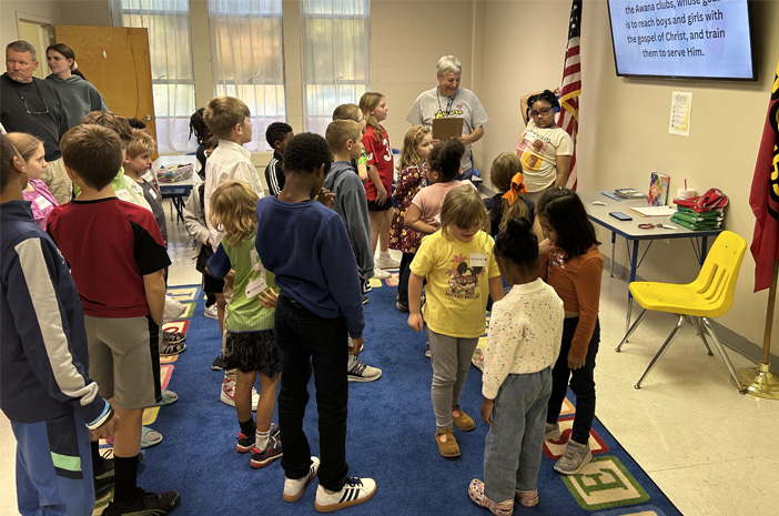 Billy Ridgway works with a group of Awanas who are looking up answers to Bible questions. |  |