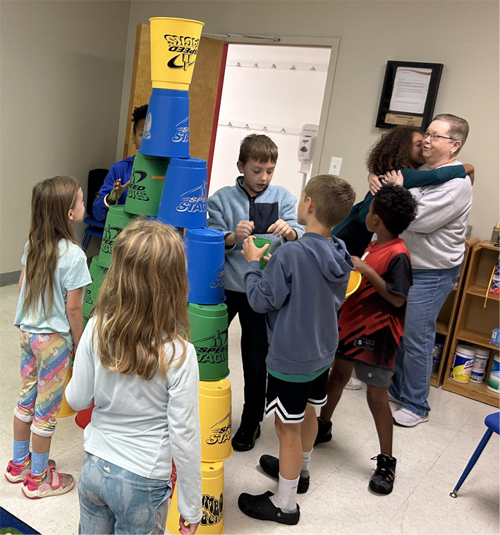 The "stacking cups" game is popular for the introductory recreation time. |  |