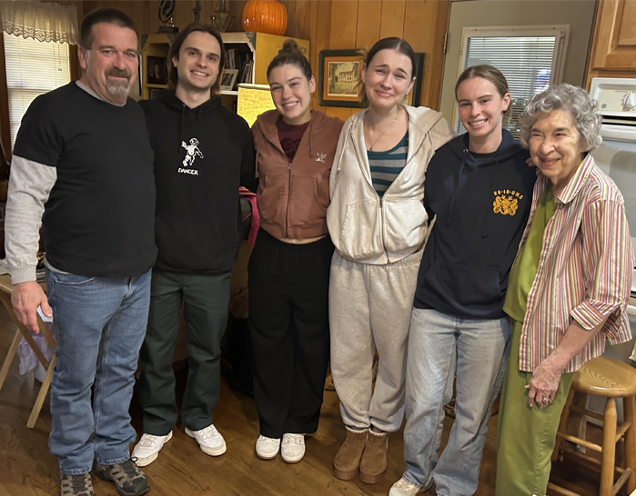 In this picture the front row is all Nave: Mark, Rod, Brenda, Jeff, Darla, Elyse. The back row is Ashleigh Nave and Jordan and Luke Zell.