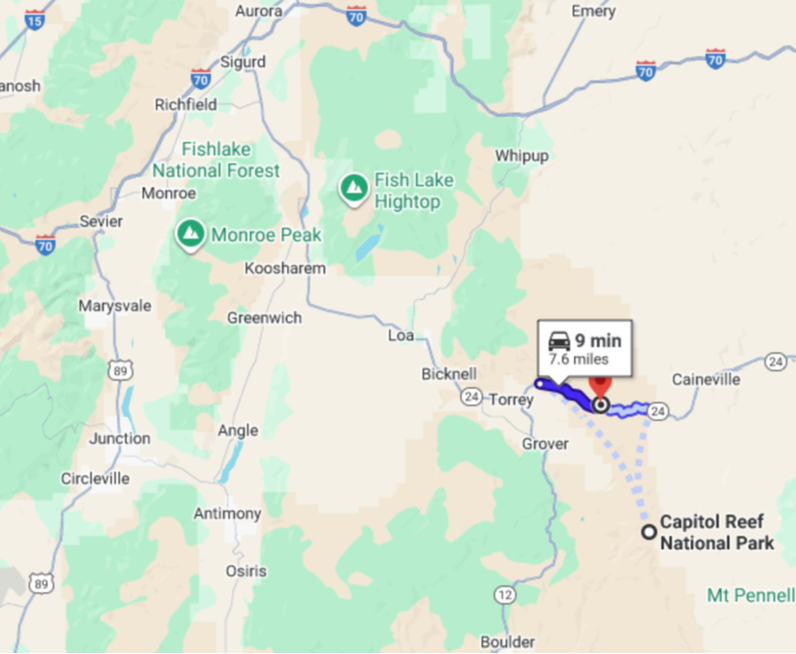 | This map shows the collection of roads near Capitol Reef National Park. Then the bottom map covers the same area but shows the location of the Hickman Bridge with the red dot, 7.6miles in or about halfway across the Capitol Reef park. It seems likely that they then followed Utah Hwy 24 up to I-70 as part of their route to Salt Lake City. |  |