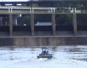 As I watched one of the jetboats leave on its tour, I got an unexpected perspective of the two Dells. As the jetboat approached the dam, a tourboat on the Upper Dells came by, showing the difference in level between the two Dells. There is a highway bridge and a railway bridge across the river just above the dam. After that brief pause, the jetboat roared off down the river and disappeared around the bend. |