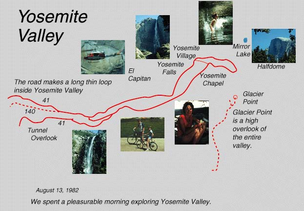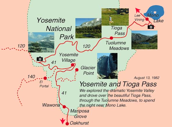 August 13: Yosemite, Tioga PassStarting mileage 3482 miles. As has become a quite satisfactory routine, we rose at 5 and left near 5:30 AM. Driving about 20 miles we entered Yosemite on beautiful roads. The drive past Wawona toward the Yosemite valley was through an exquisitely green evergreen forest, the most beautiful forest I've ever seen. It looked so perfect you were almost shocked to see a broken limb or dead tree. There were all sizes - from small Junipers to huge towering pines and Sequoias. Probably the pines here are bigger and dominate the large trees. Occasional glimpses of the forest and mountains in the distance made this a really thrilling drive. We finally reached the famous tunnel into the Yosemite Valley and paused before entering it to wake the boys and get them up to see the valley. The first valley view was dramatic - but was diminished somewhat by the fact that the early morning sun was streaming right into our eyes. We frove to Bridal Veil Falls and looked at the wispy veil-like falls plunging over the huge high granite precipice. For Brenda and I it immediately brought to mind the veil falls in the Lauterbrunnen Valley in Switzerland - actually the whole Yosemite Valley reminded us a munber of times of our favorite valley in Switzerland. Since the Bridal Veil Falls were not lit by the sun yet and the parking area was rather cool, we drove on around the short loop to the parking lot by the larger Yosemite Falls. We had a very nice breakfast there with cereal and the fresh fruit we had bought. Jeff and Mark finished their breakfast and walked down the path for the falls view while Brenda and I finished up. Then Mark and I walked back down the path. The scale of the falls is eye-popping. Upper Falls 1430 ft, Cascades 675 ft and Lower Falls 320 ft for a total drop of 2325 ft, approaching half a mile from the huge granite cliff. Its worth making the trip just to see those falls. The valley is very small and we quickly drove around all the roads. The narrow valley is ringed by the huge granite walls. A beautiful clear river runs down the middle, tumbling over rocks. Driving along one of the roads beside a meadow we saw a small spotted fawn bound across the road in stiff-legged hops, like he had springs in all four legs. Traffic in both directions came to a halt as we watched his antics. Then we saw the mother come bounding across the meadow - looking fearful and concerned. The fawn bounded to her and nudged her for some milk - but the mother finally herded him away from the road and the imminent danger of a roar of shutter clicks. We saw all the rafters on the clear river and we decided to try to rent a raft, but it was now 10:30 and the place was covered up- maybe a two hour wait. We rented bicycles for the boys and decided to let them ride while we walked up to Mirror Lake. It was a pleasant walk af about miles and I was continually distracted by the squirrels with light neck bands, the jays and the Clarks nutcracker birds, who were very tempting photographic subjects. By the time I got to Mirror Lake the boys were already in the water - but less than waist deep in the clear and very cold mountain water. We had lunch there and watched the people, birds and squirrels. Other kids were in the water and Jeff and Mark finally climbed out on a rock and jumped in. They got out of the water fast though - and all cold water since has been compared to Mirror Lake. Brenda snd Mark rode the bicycles back while Jeff and I walked. We drove back around to Yosemite Falls where I wanted to get a picture of the falls in sunlight - they had been shaded earlier. The place which had been so peaceful at our breakfost time was now covered up with people! Go early to Yosemite! I was amazed at the number of people walking down the path to view Yosemite Falls. I shot a couple of pictures and we headed for Bridal Veil Falls. Along the roadside we noticed a group of people looking up at the great rock face of El Capitan, presumably at some rock climbers. Ater snapping a couple of Bridal Veil Falls we had to swing back by there and there was so much apparent interest in the climbers that we stopped to look. We learned that one of the climbers had been injured by a falling rock and that they were going to attempt a helicopter rescue. Although you could barely see the two red specks which were the climbers, I could get a significant image with the 300mm lens 2x to 600mm. We watched the helicopter swing in a number of times to attempt the rescue, but it did not succeed and finally left. We did not hear the fate of the climber- we were leaving the area. We left the valley and began to climb the road toward Tioga Pass and got our best views of the entire Yosemite Valley with the afternoon sun now streaming down the valley. We climbed steadily into the beautiful forest, with roads and meadows dotted with wildflowers. We passed an area called a glacial morraine where there were bare rock peaks apparently showing glacial action. Coming around a high overlook we saw a blue sheet of water which was Lake Tenaya. It looked a great distance away, but when we rounded the next sweeping curve,there it was. We stopped alongside for the boys to throw rocks and for me to photograph a couple of wild flowers. Not too much further along we came to a place where lovely clear streams ran meandering paths thorugh lush green meadows and wildflowers. With the mountain background and clear air the Tolumne Meadows ore one of the most beautiful places Ive ever seen. We even considered camping there in a primitive site just to be close to these meadows and the snow patches which had so fascinated the boys. Alas, the same urge had also occurred to hundreds of other people and all campgrunds were full. We talked to an Australian couple camped in one of the streamside sites and they said only in early morning were sites to be had, and that many campers stayed the 14 day limit. We really needed to move on down the road anyway, but