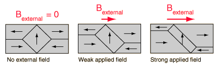 Magnetic DomainsThe microscopic ordering of electron spins characteristic of ferromagnetic materials leads to the formation of regions of magnetic alignment called domains. ![]() The main implication of the domains is that there is already a high degree of magnetization in ferromagnetic materials within individual domains, but that in the absence of external magnetic fields those domains are randomly oriented. A modest applied magnetic field can cause a larger degree of alignment of the magnetic moments with the external field, giving a large multiplication of the applied field. These illustrations of domains are conceptual only and not meant to give an accurate scale of the size or shape of domains. The microscopic evidence about magnetization indicates that the net magnetization of ferromagnetic materials in response to an external magnetic field may actually occur more by the growth of the domains parallel to the applied field at the expense of other domains rather than the reorientation of the domains themselves as implied in the sketch. ![]() Some of the more direct evidence we have about domains comes from imaging of domains in single crystals of ferromagnetic materials. The sketches above are after Young and are adapted from magnified images of domain boundaries in single crystals of nickel. They suggest that the effect of external magnetic fields is to cause the domain boundaries to shift in favor of those domains which are parallel to the applied field. It is not clear how this applies to bulk magnetic materials which are polycrystalline. Keep in mind the fact that the internal magnetic fields which come from the long range ordering of the electron spins are much stronger, sometimes hundreds of times stronger, than the external magnetic fields required to produce these changes in domain alignment. The effective multiplication of the external field which can be achieved by the alignment of the domains is often expressed in terms of the relative permeability. Domains may be made visible with the use of magnetic colloidal suspensions which concentrate along the domain boundaries. The domain boundaries can be imaged by polarized light, and also with the use of electron diffraction. Observation of domain boundary movement under the influence of applied magnetic fields has aided in the development of theoretical treatments. It has been demonstrated that the formation of domains minimizes the magnetic contribution to the free energy. |