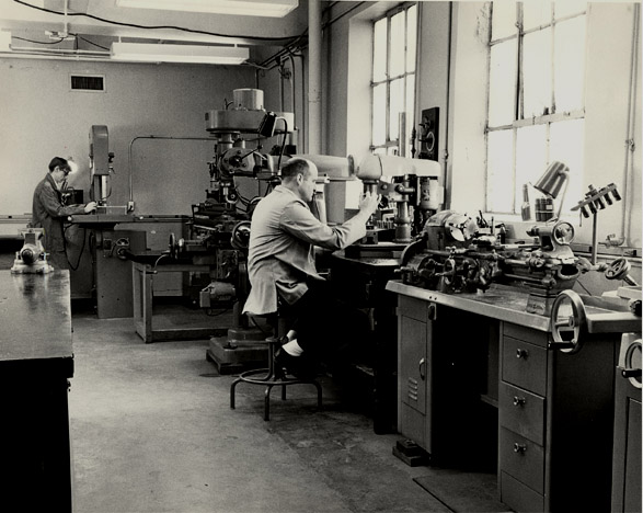 Shown above right is a precession photograph that shows evidence of a single crystal that is very nearly aligned. The X-ray exposure dots reveal the symmetry of the crystal and can be used to get relative measurements of the crystal lattice spacing. ![]() Dan Witt, Shop Manager and Machinist, in the Physics and Astronomy Shop. Graduate Student Kerry Pullen at bandsaw at left.