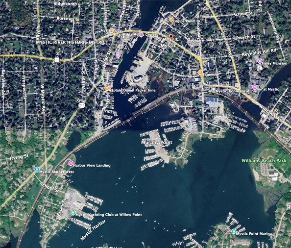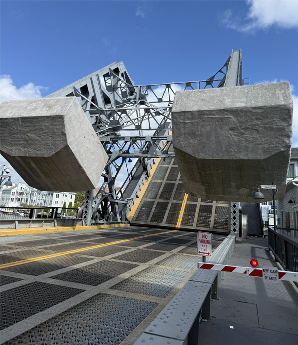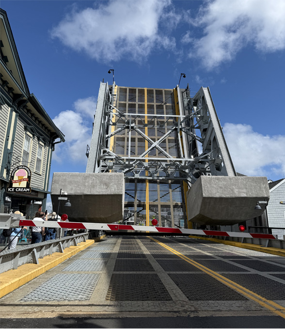 Through the community of Mystic runs the Mystic River. To allow boat traffic at scheduled times through that river is a very remarkable bridge. Ashleigh's comment (9/4/25): "Watched the Mystic bascule bridge go up today. One of the very few counterweight bridges left in the U.S.! Thought you'd enjoy these photos. " |  |