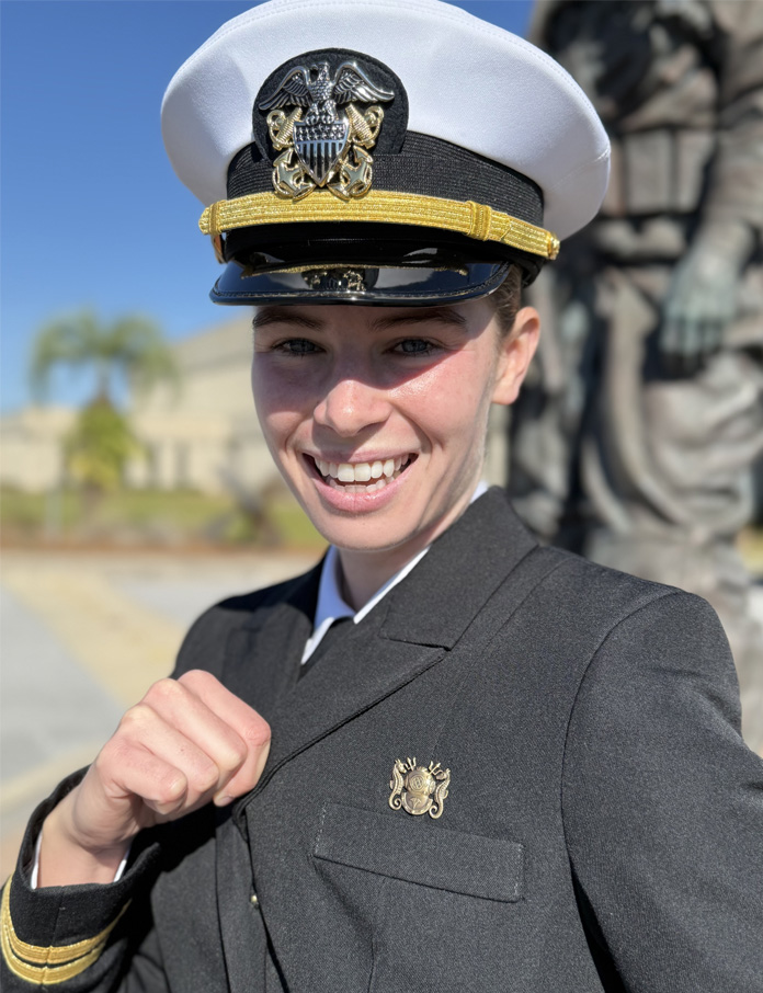 | Ashleigh had reason to be proud of the unique specialty medal for undersea training with the Navy. |