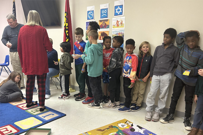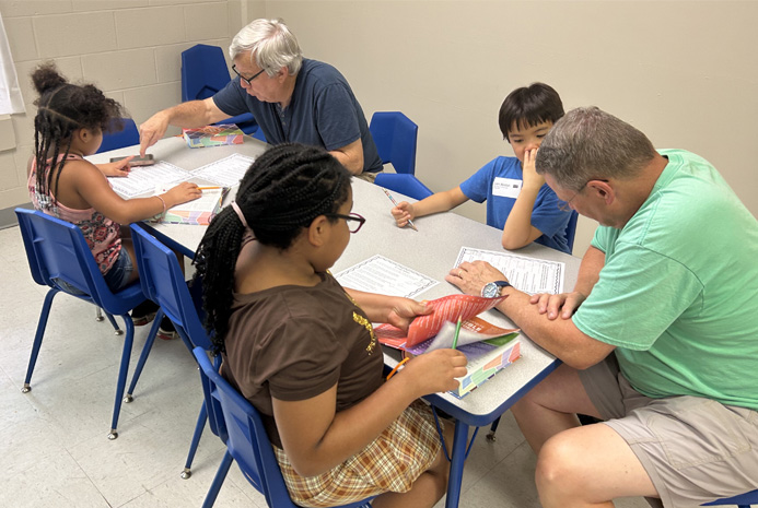 | Johnny Huffman and Tony Mode work with another group of Awanas who are finding answers to questions in the Bible. |