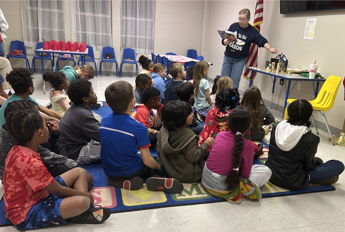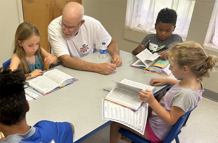 Billy Ridgway works with a group of Awanas who are looking up answers to Bible questions. |  |