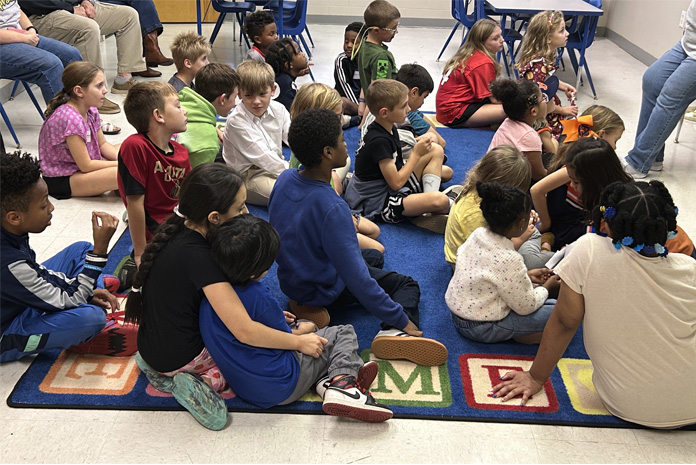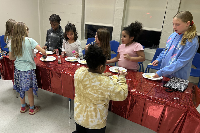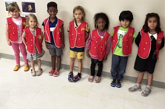 | After our pledges, the Awana group settled in for snack time. Johnny Huffman and Tony Mode accompany them. |