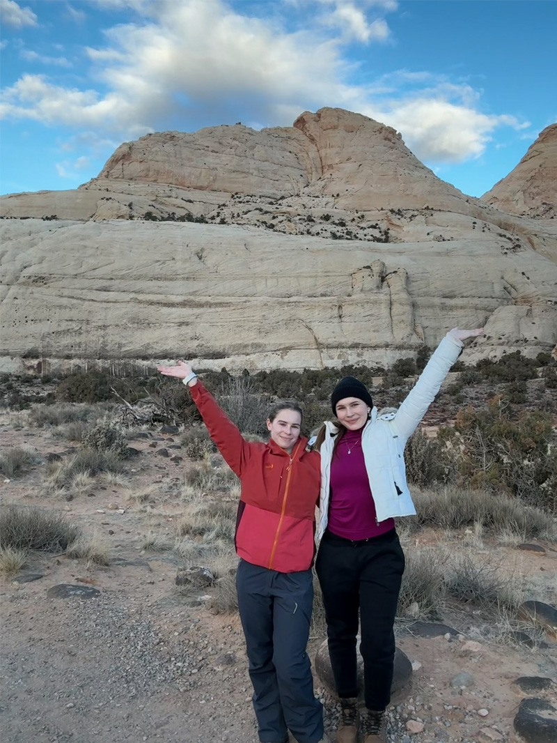 Ashleigh and Elyse in Capitol Reef National Park in southern Utah.They traveled there from Monument Valley, which is in the north right edge of the map of Arizona shown at right. They had traveled eastward from Zion to get to Monument Valley. | On January 7 they drove to Capitol Reef to begin hiking there and were able to hike across the Cassidy arch. This photo is dated January 8 at 3:10m.