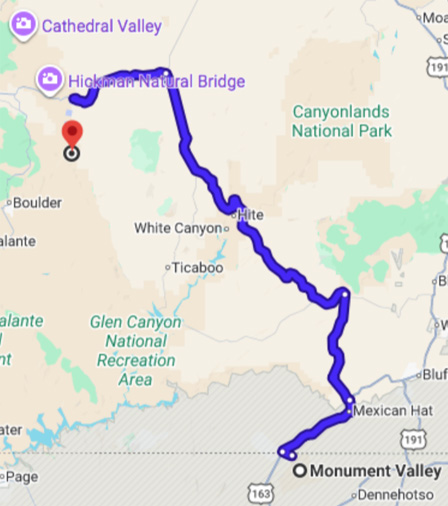 Since their next destinations were to the north of Monument Valley at Capitol Reef and Hickman Bridge, the route shown to the right seems reasonable. |  |