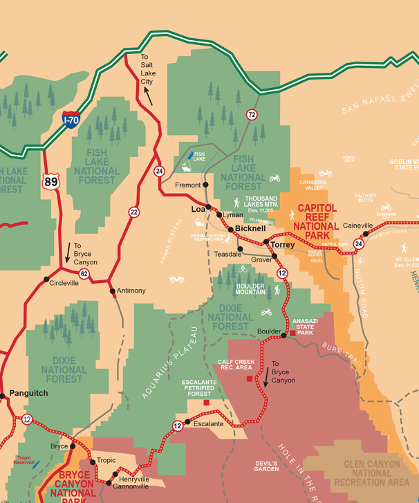 | This map shows the collection of roads near Capitol Reef National Park. Then the bottom map covers the same area but shows the location of the Hickman Bridge with the red dot, 7.6miles in or about halfway across the Capitol Reef park. It seems likely that they then followed Utah Hwy 24 up to I-70 as part of their route to Salt Lake City. |  |
