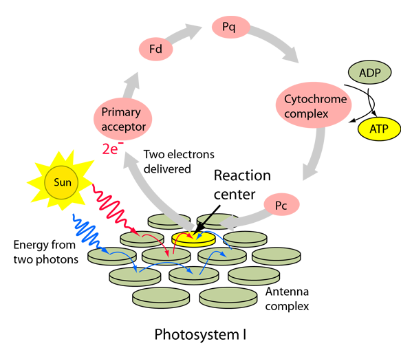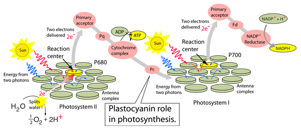 PlastocyaninPlastocyanin is a copper-containing protein that plays a role in the electron transport process associated with photosynthesis. It serves as an electron transfer agent between the cytochrome complex which follows Photosystem II and the entry point to Photosystem I of the non-cyclic electron transfer process. ![]() The sketch below shows the context of plastocyanin's role in the context of the thylakoid membrane in which this process operates. ![]() Plastocyanin also plays a role in the cyclic electron transport employed in some photosynthetic prokaryotes, as indicated below. ![]() In this cyclic process, photosynthesis is used only to provide for the production of ATP for immediate energy needs, and the plastocyanin returns the electrons to Photosystem I.