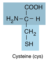 | Two cysteine molecules can bond to form cystine with a disulfide bond. In protein structures, disulfide bonds between cysteines from separate points in the polypeptide can influence the bending and shape of the protein. Insulin is an example of a protein with such cystine crosslinking. |