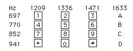Telephone Tone Dialing![]() Each key on the telephone in the "touchtone" system produces two tones, one indicating the row and the other the column of the key. If you produce those two tones simultaneously with an external tone generator and play them into the earpiece, they will be accepted by the phone as the corresponding key on the keypad. |