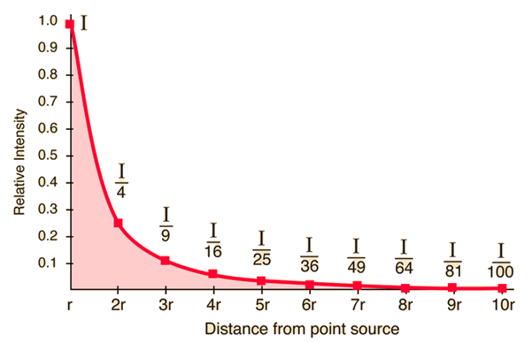 Inverse Square Law, SoundThe sound intensity from a point source of sound will obey the inverse square law if there are no reflections or reverberation. A plot of this intensity drop shows that it drops off rapidly. ![]()