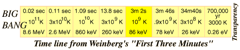![]() Time:34min40s, Temperature: 3x108 K Density 10 Nuclear processes are stopped, expansion and cooling continues. About 1 in 109 electrons left because of slight excess of electrons over positrons in primeval fireball. The reason for the excess of matter over antimatter is a continuing investigation. Energy density is about 69% photons, 31% neutrinos. |