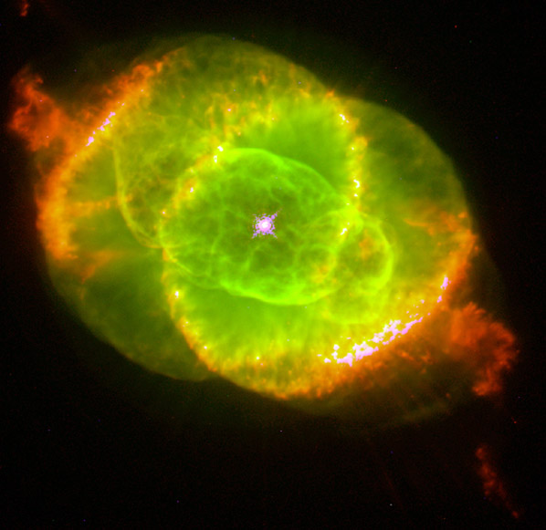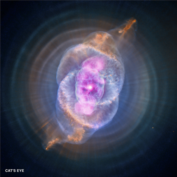 Catseye Nebula![]() This image of the planetary nebula NGC 6543 was captured by the Hubble Space Telescope. It is one of the most complex planetary nebulae ever seen. The Hubble image reveals "surprisingly intricate structures including concentric gas shells, jets of high-speed gas and unusual shock-induced knots of gas. Estimated to be 1,000 years old, the nebula is a visual "fossil record" of the dynamics and late evolution of a dying star. A preliminary interpretation suggests that the star might be a double-star system. The suspected companion star also might be responsible for a pair of high-speed jets of gas that lie at right angles to this equatorial ring. If the companion were pulling in material from a neighboring star, jets escaping along the companion's rotation axis could be produced. These jets would explain several puzzling features along the periphery of the gas lobes. Like a stream of water hitting a sand pile, the jets compress gas ahead of them, creating the "curlicue" features and bright arcs near the outer edge of the lobes. The twin jets are now pointing in different directions than these features. This suggests the jets are wobbling, or precessing, and turning on and off episodically. ![]() Photo credit: NASA J.P.Harrington and K.J.Borkowski University of Maryland. ![]() Adding drama to the Cats Eye, this view superimposes the X-ray image of the nebula upon the visual image above. The X-ray image, shown in purple, was taken by the Chandra X-ray Observatory.