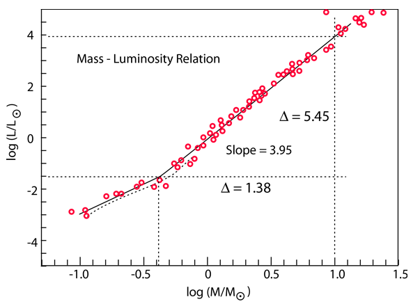 The determination of a power relationship can be done by doing a log-log plot of the luminosities and masses. The slope of such a plot gives the power. Below is such a plot of data included in Harwit and attributed to the Royal Astronomical Society.