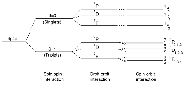Influences on Atomic Energy Levels![]() Adapted from Leighton. Energies are not to scale. The labeling of the diagrams follows the scheme of the spectroscopic notation.