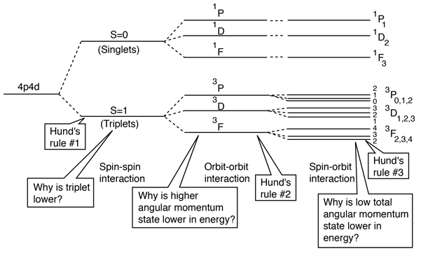 Orbit-Orbit InteractionIf two electrons in an atom spend a lot of time close to each other, then they contribute a repulsive or positive potential energy, implying that their energy level will be higher. If the electrons are orbiting in the same direction (and so have a large total angular momentum) they meet less often than when they orbit in opposite directions. Hence their repulsion is less on average when L is large. The fact that such electron configurations have lower energy means that they will be filled first, and this fact is noted in "Hund's rule #2". |