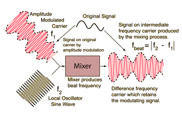 Heterodyne PrincipleHeterodyning is a method for transferring a broadcast signal from its carrier to a fixed local intermediate frequency in the receiver so that most of the receiver does not have to be retuned when you change channels. The interference of any two waves will produce a beat frequency, and this technique provides for the tuning of a radio by forcing it to produce a specific beat frequency called the "intermediate frequency" or IF. Heterodyning is used in the AM radio receiver and played a big part in making AM radio practical for mass communication. ![]() An electromagnetic carrier wave which is carrying a signal by means of amplitude modulation or frequency modulation can transfer that signal to a carrier of different frequency by means of heterodyning. This transfer is accomplished by mixing the original modulated carrier with a sine wave of another frequency. This process produces a beat frequency equal to the difference between the frequencies, and this difference frequency constitutes a third carrier which will be modulated by the original signal. Heterodyning is extremely important in radio transmission -- in fact, the development of heterodyning schemes was one of the major developments which led to mass communication by radio. By fixing the beat frequency between the incoming carrier and the local oscillator to a fixed intermediate frequency (IF), most of a radio receiver can be constructed so that it can be used by any incoming radio signal. When the input radio frequency amplifier is tuned to the station's carrier frequency, the local oscillator is tuned along with it to produce a beat frequency equal to the fixed IF frequency. We now take for granted that one radio receiver can be tuned to any of the locally broadcast radio stations, but if it were not for heterodyning, you would have to have one receiver for each broadcast station.