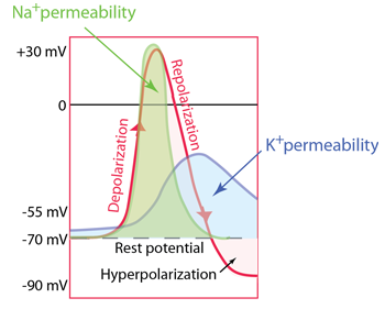 Hyperpolarization is the name given to the period of overshoot of the interior cell potential to values more negative than the normal rest state. One influence in this phase is the fact that the Na+ gates remain closed and the lack of Na+ mobility across the membrane causes the K+ process to proceed toward the value of -80mV which would occur if potassium alone were present. While hyperpolarization might seem to be counterproductive, it is actually important in the transmission of information. Hyperpolarization prevents the neuron from receiving another stimulus during this time, or at least raises the threshold for any new stimulus. Part of the importance of hyperpolarization is in preventing any stimulus already sent up an axon from triggering another action potential in the opposite direction. In other words, hyperpolarization assures that the signal is proceeding in one direction.