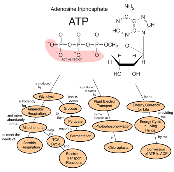 Conversion from ATP to ADPAdenosine triphosphate (ATP) is the energy currency of life and it provides that energy for most biological processes by being converted to ADP (adenosine diphosphate). Since the basic reaction involves a water molecule, this reaction is commonly referred to as the hydrolysis of ATP. ![]() The structure of ATP has an ordered carbon compound as a backbone, but the part that is really critical is the phosphorous part - the triphosphate. Three phosphorous groups are connected by oxygens to each other, and there are also side oxygens connected to the phosphorous atoms. Under the normal conditions in the body, each of these oxygens has a negative charge, and as you know, electrons want to be with protons - the negative charges repel each other. These bunched up negative charges want to escape - to get away from each other, so there is a lot of potential energy here. If you remove just one of these phosphate groups from the end, so that there are just two phosphate groups, the molecule is much happier. If you cut this bond, the energy is sufficient to liberate about 7000 calories per mole, about the same as the energy in a single peanut. Living things can use ATP like a battery. The ATP can power needed reactions by losing one of its phosphorous groups to form ADP, but you can use food energy in the mitochondria to convert the ADP back to ATP so that the energy is again available to do needed work. In plants, sunlight energy can be used to convert the less active compound back to the highly energetic form. For animals, you use the energy from your high energy storage molecules to do what you need to do to keep yourself alive, and then you "recharge" them to put them back in the high energy state.