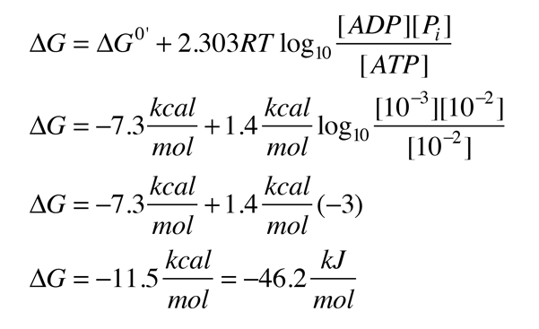 Free Energy from Hydrolysis of ATPAdenosine triphosphate (ATP) is the energy currency of life and it provides that energy for most biological processes by being converted to ADP (adenosine diphosphate). Since the basic reaction involves a water molecule, this reaction is commonly referred to as the hydrolysis of ATP. The change in Gibbs free energy in the reaction is used to assess the energy yield of such reactions, and as a general indicator of the spontaneity of reactions. Under standard conditions this change ΔG0' is .But inside a living cell, typical concentrations of the reactants might be [ATP]=10mM, [ADP]=1mM and [Pi]=10mM. Under those conditions the free energy change is .Because of the concentrations of ATP and ADP in the cell, the conditions are very favorable for the use of the hydrolysis of ATP as an energy source. In fact, many processes with positive ΔG values can take place when coupled with the hydrolysis of ATP.