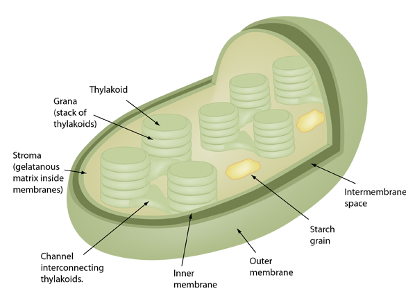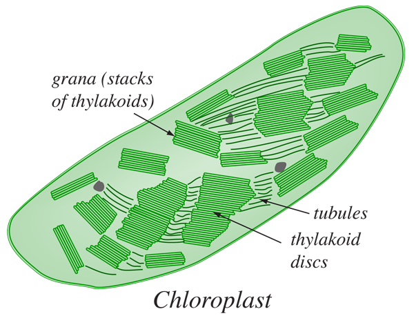 The sketch of the chloroplast above was made from an electron micrograph of a chloroplast from a higher order plant (Levy). Plants use energy from the sun in tiny energy factories called chloroplasts. Using chlorophyll in the process called photosynthesis, they convert the sun's energy into storable form in ordered sugar molecules such as glucose. In this way, carbon dioxide from the air and water from the soil in a more disordered state are combined to form the more ordered sugar molecules.