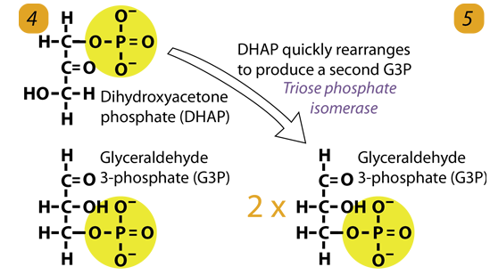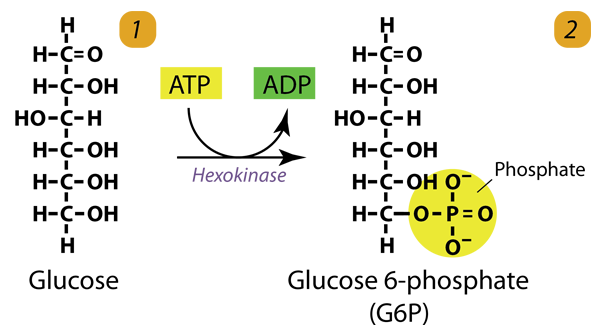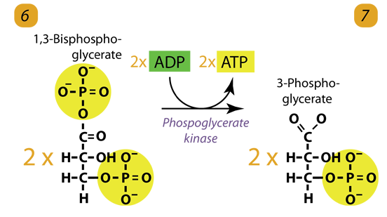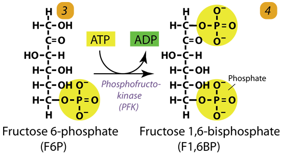 Steps of Glycolysis![]() Glycolysis is a series of reactions which starts with glucose and has the molecule pyruvate as its final product. Pyruvate can then continue the energy production chain by proceeding to the TCA cycle, which produces products used in the electron transport chain to finally produce the energy molecule ATP. The first step in glycolysis is the conversion of glucose to glucose 6-phosphate (G6P) by adding a phosphate, a process which requires one ATP molecule for energy and the action of the enzyme hexokinase. Each step of glycolysis operates with the aid of an enzyme, which greatly speeds up the reactions to allow the process to proceed fast enough for metabolic needs. Ahearn comments that enzymes allow reactions to run at the "speed of life". ![]() This step involves a simple rearrangement of G6P to produce Fructose 6-phosphate (F6P). It forms the substrate for the next step which is crucial control point. ![]() In this step a second ATP is required to add a second phosphate to F6P. This forms Fructose 1,6-biphosphate (F1,6BP). The enzyme involved is Phosphofructokinase (PFK). This enzyme is capable of controlling the entire pathway as seen below. To this point, the process involves rearrangement with the investment of two ATP. This energy is used to add two phosphates, and marks the end of the energy investment phase. ![]() Catalyzed by the enzyme aldolase, the F1,6BP is split into two three-carbon molecules, Dihydroxyacetone phosphate (DHAP) and Glyceraldehyde 3-phosphate (G3P). These two molecules are isomers, and each can be easily rearranged into the other. ![]() Catalyzed by Triose phosphate isomerase, the DHAP is quickly rearranged to produce a second G3P. The process to this point has converted one 6-carbon molecule of glucose into two 3-carbon G3P molecules. ![]() Starting at this step, glycolysis becomes a process of energy generation where ATP is made. At the beginning of this process, the G3P is converted to 1,3-bisphosphoglycerate. This involves the addition of another phosphate. In this process the adehyde molecule is converted into an acid.This process of conversion of the aldehyde to an acid is an oxidation. In the process the molecule being oxidized loses two electrons, and it gives those two electrons to NAD+ which accepts them plus a proton to produce NADH. We had two G3P molecules, so we we get two molecules of 1,3 bisphosphoglycerate, and gain two NADHs out of this reaction. These will be used in the electron transport chain to provide a much bigger energy payoff. The acid group created by the oxidation reaction gives a phosphate to 1,3 bisphosphoglycerate. This phosphate addition is different from the ones seen so far which required ATP energy. This phosphate is not from ATP, but is a free phosphate added onto the acid. The energy for doing this comes from the oxidation of the same step. That's why we don't need ATP energy to add the phosphate. The net output from this step is two 1,3 bisphosphoglycerates and two NADHs. ![]() This step begins the part of glycolysis where ATP is made. First, a phosphate is transferred away from each of the two 1,3 Bisphosphoglycerates to add to ADP and make ATP. This leaves behind two molecules of 3-Phosphoglycerate. ![]() The two molecules of 3-Phosphoglycerate undergo rearrangement to produce 2-Phosphoglycerate. ![]() The two 2-Phosphoglycerate molecules with the action of the enolase enzyme form two molecules of phosphoenylpyruvate (PEP). PEP is the substrate for the final step of glycolysis. ![]() With the aid of the enzyme pyruvate kinase, the final step produces two ATPs and two molecules of pyruvate. There is enough energy left over to almost produce two more ATPs, but since it falls short, this energy is given off as heat. ![]()