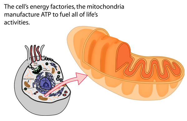 Mitochondria are the energy factories of the cells. The energy currency for the work that animals must do is the energy-rich molecule adenosine triphosphate (ATP). The ATP is produced in the mitochondria using energy stored in food. Just as the chloroplasts in plants act as sugar factories for the supply of ordered molecules to the plant, the mitochondria in animals and plants act to produce the ordered ATP molecules as the energy supply for the processes of life. A typical animal cell will have on the order of 1000 to 2000 mitochondria. So the cell will have a lot of structures that are capable of producing a high amount of available energy. This ATP production by the mitochondria is done by the process of respiration, which in essence is the use of oxygen in a process which generates energy. This is a very efficient process for using food energy to make ATP. One of the benefits of "aerobic exercise" is that it improves your body's ability to make ATP rapidly using the respiration process. All living cells above the level of microbes have mitochondria. Hair cells and outer skin cells are dead cells and no longer actively producing ATP, but all cells have the same structure. Some cells have more mitochondria than others. Muscle cells have many mitochondria, which allows them to respond quickly to the need for doing work. Mitochondria occupy 15 to 20 percent of mammalian liver cells according to Karp.