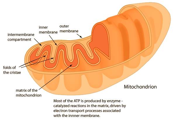 This perspective of the structure of a mitochondrion is modeled after a perspective in Audesirk & Audesirk. It depicts an individual, sausage-shaped mitochondrion, which are typically 1 to 4μ long. There is a great variety in structure including tubular structures with multiple branches. They can divide by fission and fuse into complex structures. Karp has electron micrographs of several varieties. The common elements include an outer membrane that is porous, penetrated by integral proteins called porins. They also include much less porous inner membranes formed in double-layered membranous sheets called cristae.