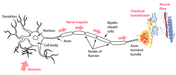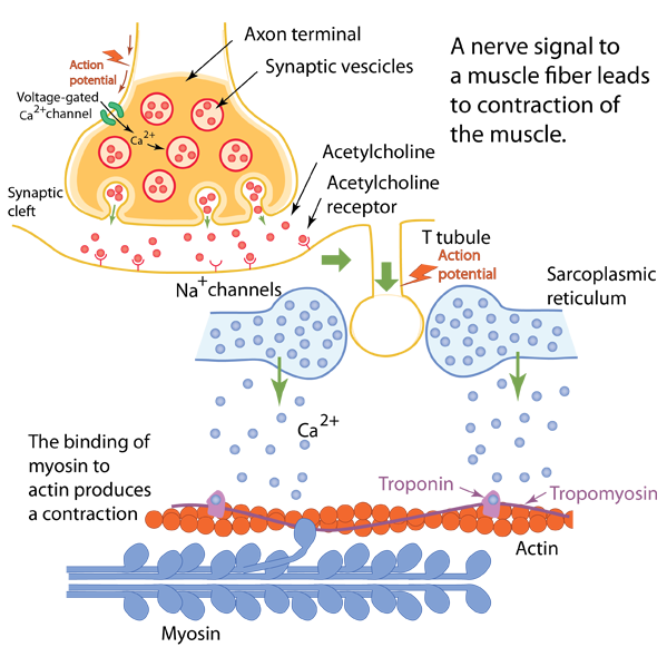 The illustration below is a schematic representation of the process from the arrival of a nerve signal to the terminal bundle of the nerve axon to the contration of a muscle fiber. The stimulation of muscle action is associated with the neurotransmitter chemical acetylcholine.